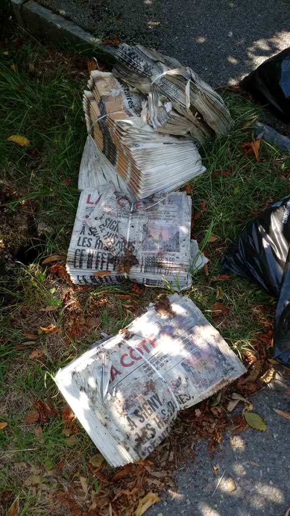 - 30 litres de journaux tout neufs encore empaquetés (La Côte et GHI), mais plus recyclables car trop abîmés